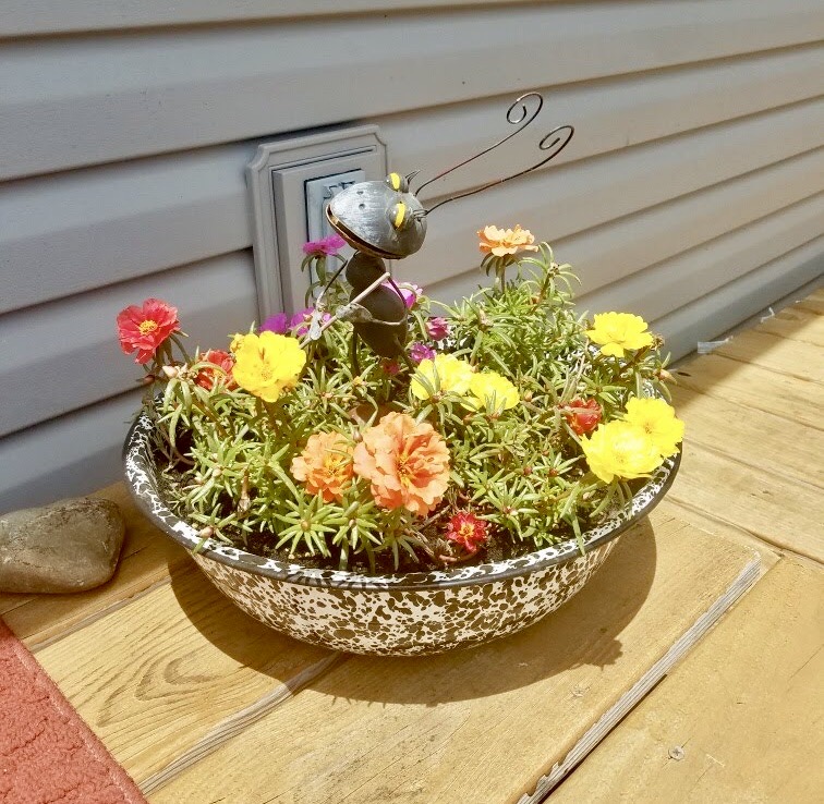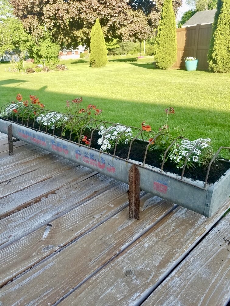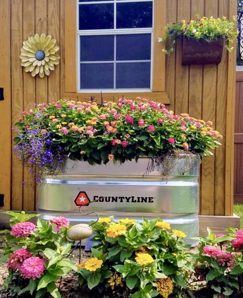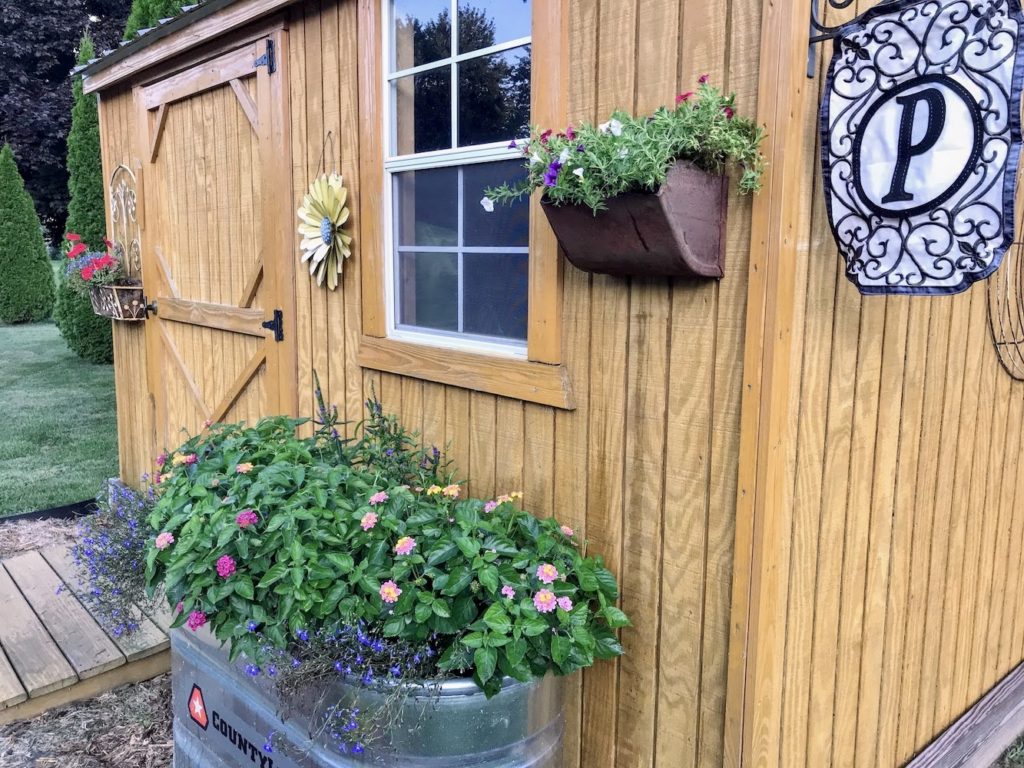 小屋の前に植えたお花たち。カントリースタイルと書かれたデカいカン?に花たちを植えるというアイディアには驚かされたと同時に感動しました。