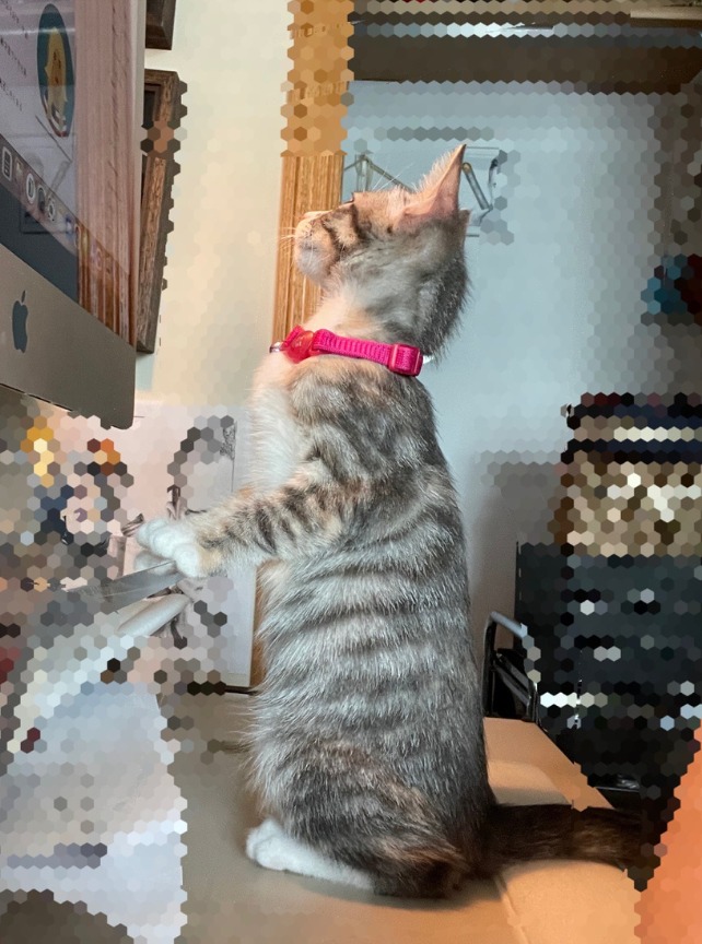 また、私がコンピューターの前に座ると、写真のように必ず邪魔してくるので、私がキーボードを取り上げて相手にしなかったらこのポーズで画面を見てました。