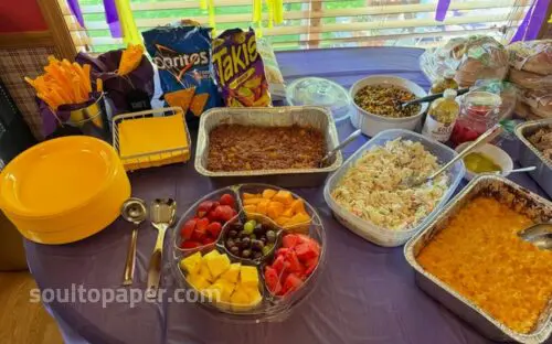 プルドポーク、マカロニ・アンド・チーズ、チキンケバブ、チキン焼きそば、ちらし寿司、いなり寿司、ソーキ汁、枝豆サラダ、コールスロー、果物。