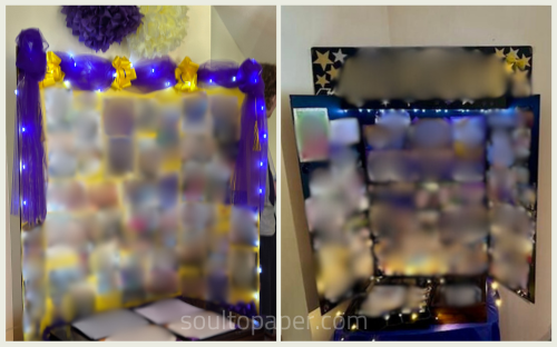 1.黒のボードには、娘の幼い頃の写真を左側に貼り、右側には沖縄での思い出と、小学生から中学生までの思い出の写真を貼って、真ん中には、高校時代の思い出の写真をたくさん貼りました。