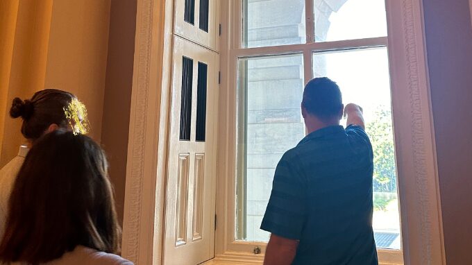 こちらの窓は、当時の米国大統領ドナルド・トランプの支持者によってバリケードを突破され、議事堂内に侵入された際に破られた窓。