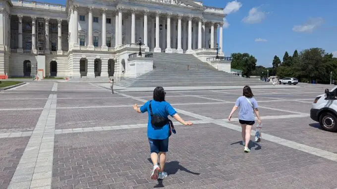 アメリカ合衆国議会議事堂の広場でスキップする私は変な人・苦笑